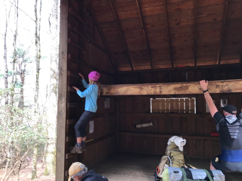 Got back to parking lot and started hiking with 3 thru hikers that ada to a liking to right away. Crunchy a 7th grade science teacher who had hip replacement. Happiest guy ever. He immediately started quizzing Ada on stuff. In a fun way. Ever since then the two have been chatting up a storm. Also hiking was his buddy Durango. A whitewater rafting instructor at the NOC. He was having a rough go as the approach trail did a number on his knees. And finally Mamma Luna. A Native American part of the Cherokee tribe.